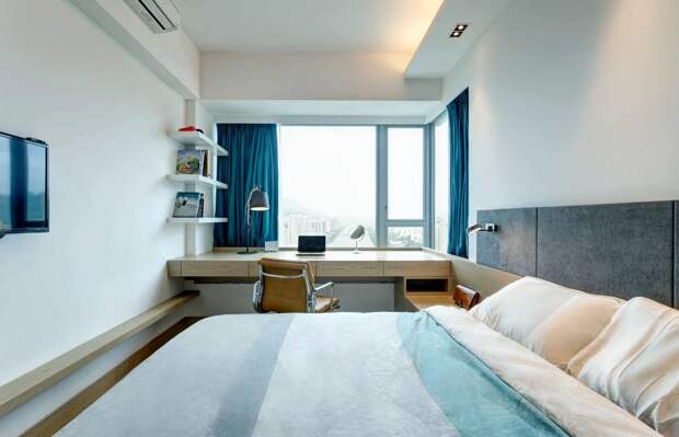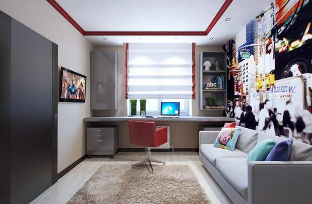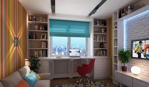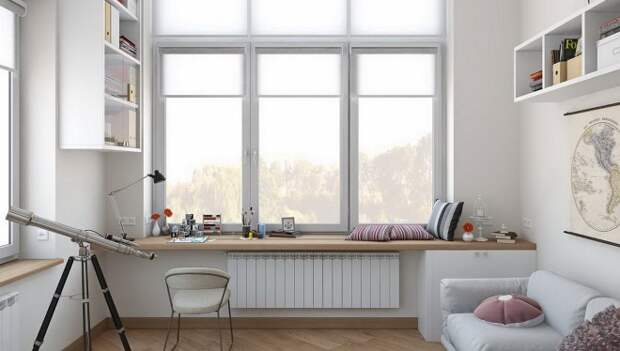 Установка столешницы вместо подоконника позволяет сэкономить место и грамотно распланировать пространство. Это идеальный вариант для детской, потому что у ребенка ноги всегда находятся в тепле (около батареи), а на тетради и клавиатуру падает дневной свет. Используйте пространство в комнате подростка рационально!