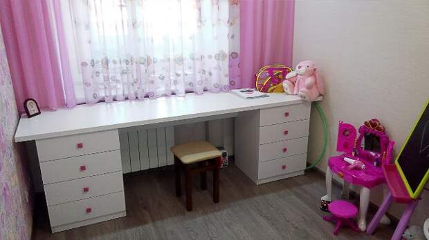 Для маленькой детской установка столешницы с выдвижной поверхностью – отличное решение. Ее нижняя часть легко закатывается под подоконник, и в комнате становится больше места.