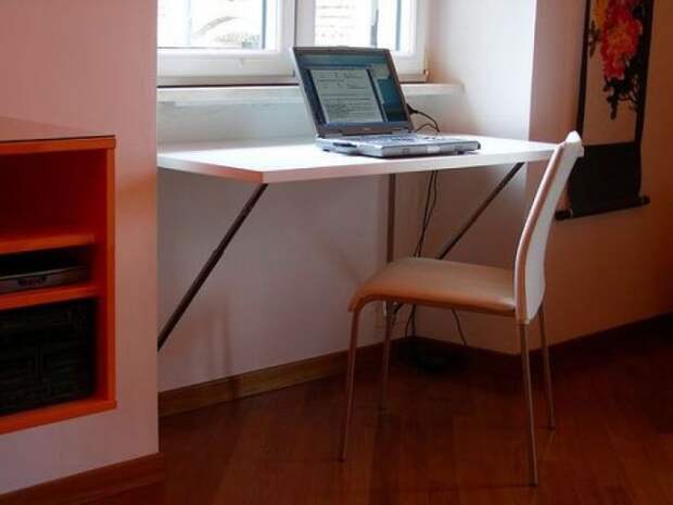 Если комната небольшая, можно установить раскладную столешницу. Такие трансформеры подходят для утепленных балконов и лоджий, на которых оборудуют рабочее место.