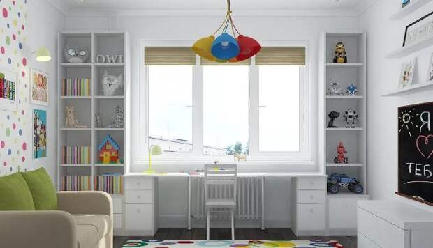 Этот вариант подходит для любых интерьеров. Чтобы использовать каждый сантиметр пространства под окном, сделайте столешницу от стены до стены. У ребенка появится длинный стол, на котором поместится компьютер, все тетради и книги.