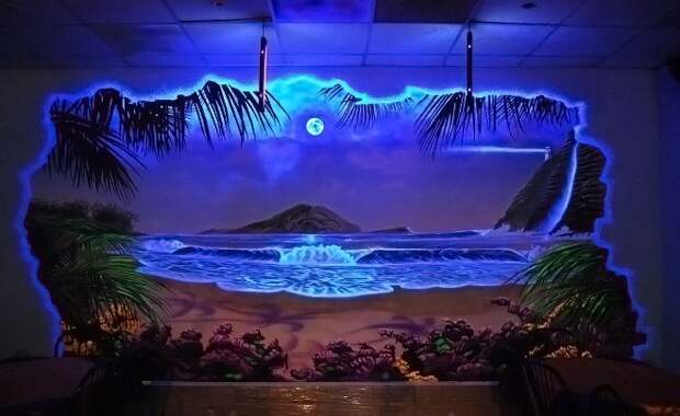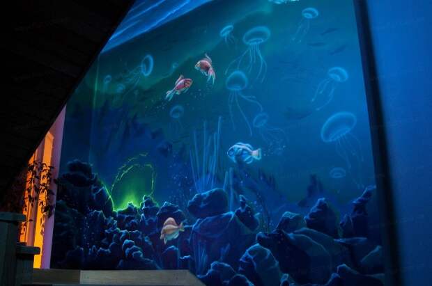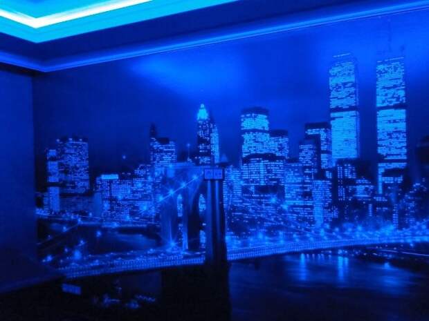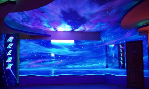 На таких полотнах светятся в темноте отдельные элементы. Эффект достигается за счет специального флуоресцентного состава, который наносится на слой. Так, обычная детская комната в темное время суток превращается в сказочный мир.