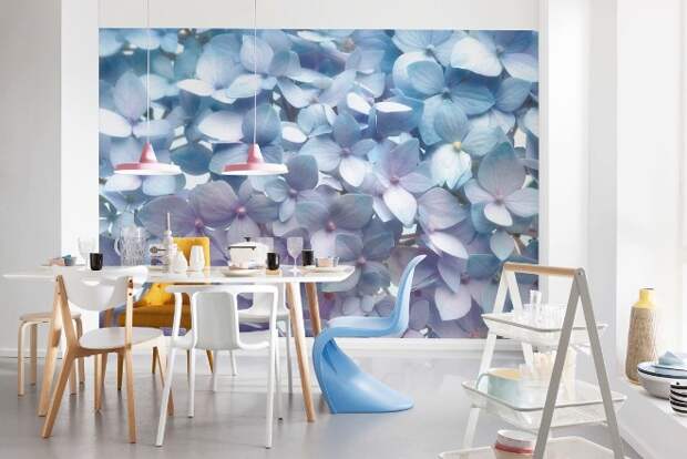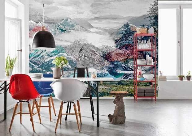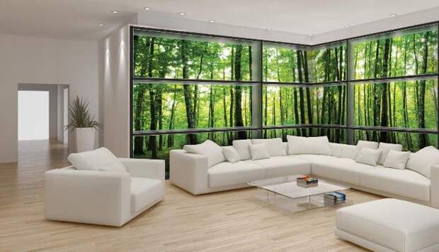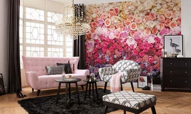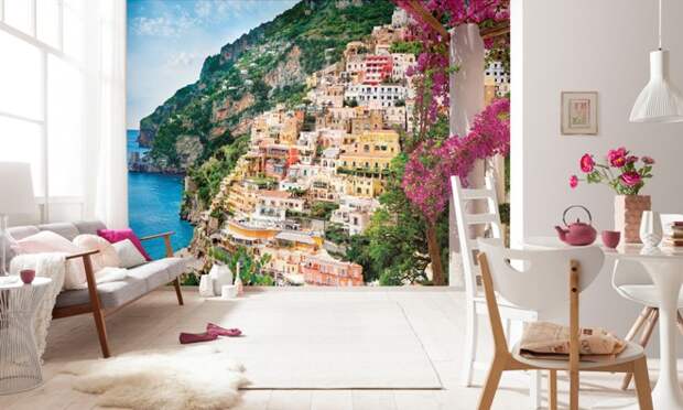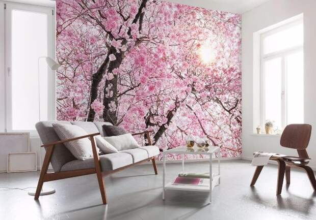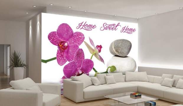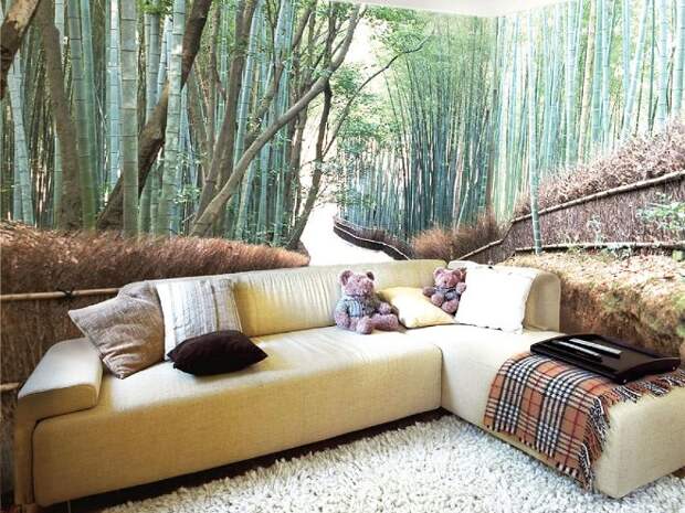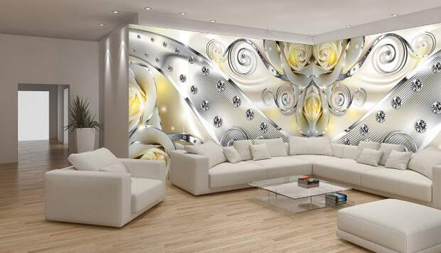 Такими обоями оклеивают сразу несколько смежных стен. Благодаря увеличенной ширине полотен (до 10 м) достигается идеальное изображение из-за отсутствия стыков. С их помощью удобно зонировать комнату или создавать акцент на какой-либо ее части.