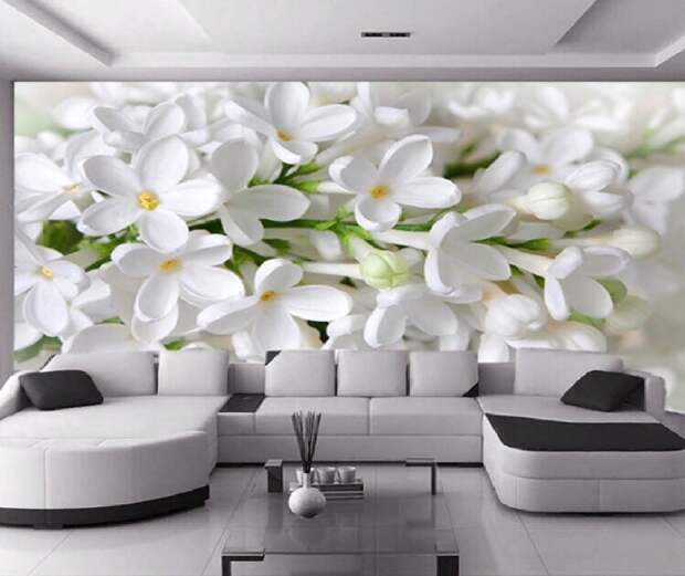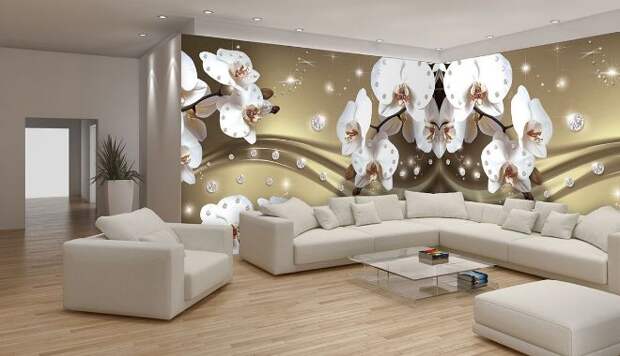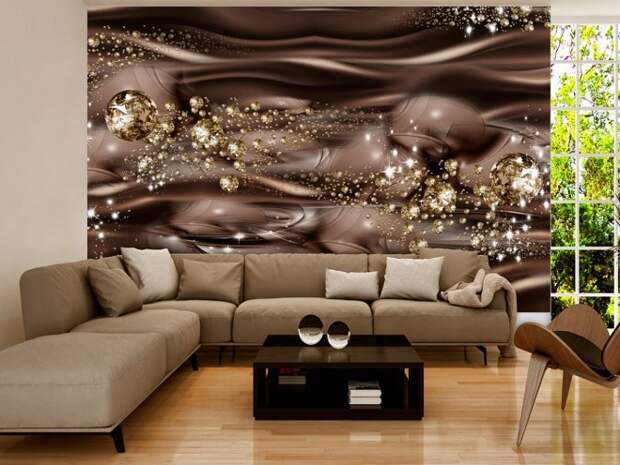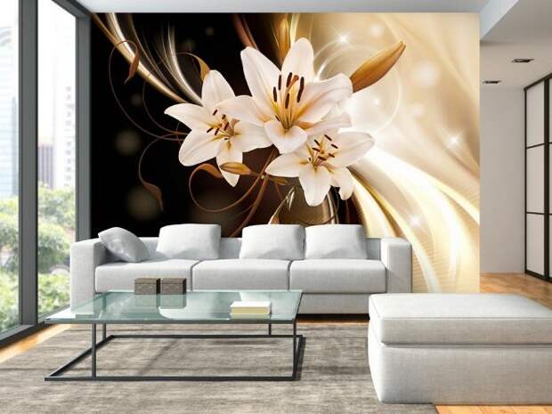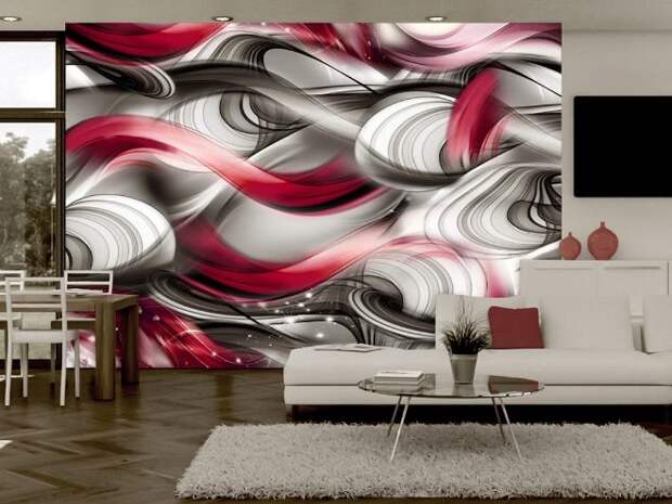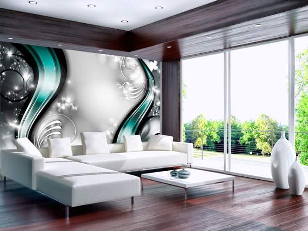 Стереообои 3д на стену в интерьере гостиной могут стать воплощением самых смелых идей. Здесь уместно разместить как пейзажи, так и графические рисунки, абстракцию. Цветовые решения тоже зависят от стиля комнаты и полета фантазии. Яркое изображение цветка (как акцент), объемные капли воды или черные геометрические фигуры – в гостиной будут смотреться сотни вариантов.
