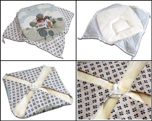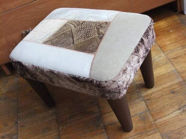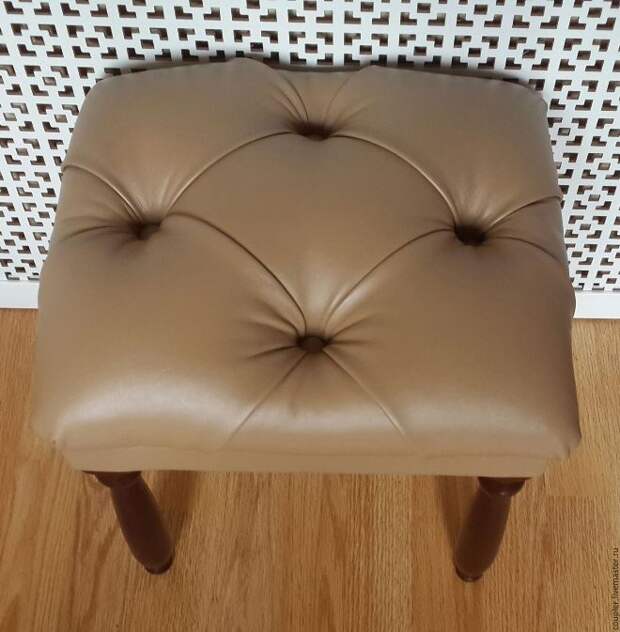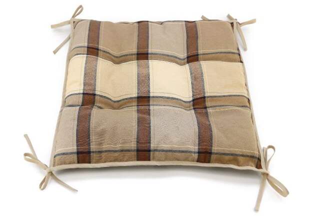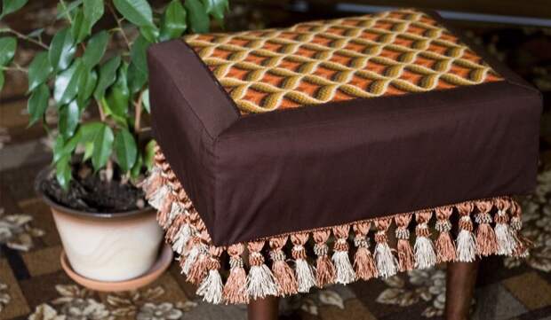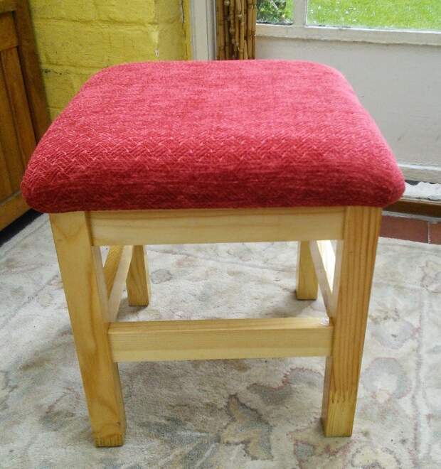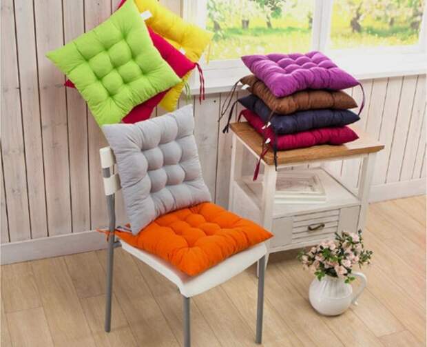 - «Сидушка» – подушка, имеющая форму сиденья. Ее легко изготовить: кусок поролона достаточно обтянуть материалом и сшить съемный чехол. Фиксировать подушку можно разными способами: ленточками привязывать к ножкам табурета, по периметру чехла прострочить кулиску и продеть резинку.