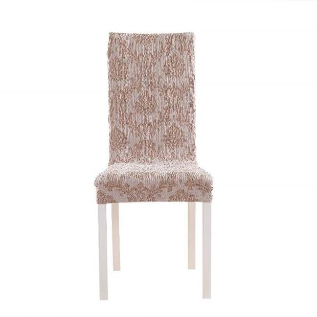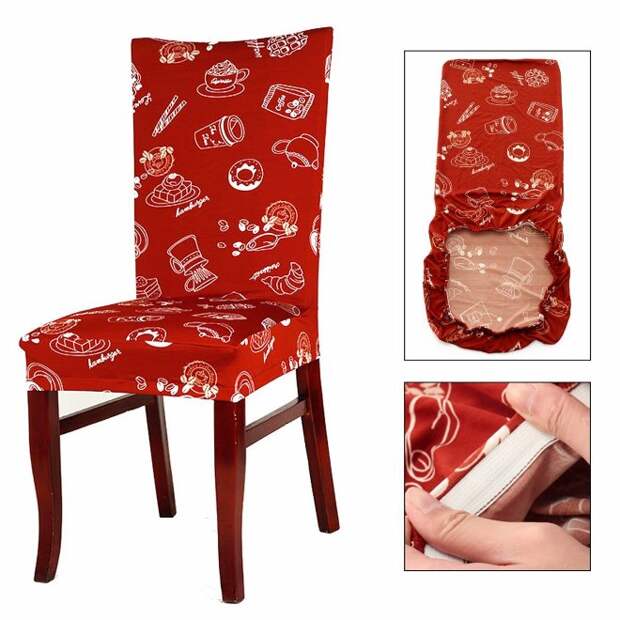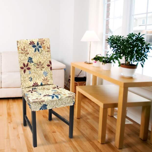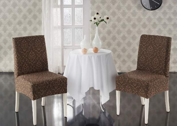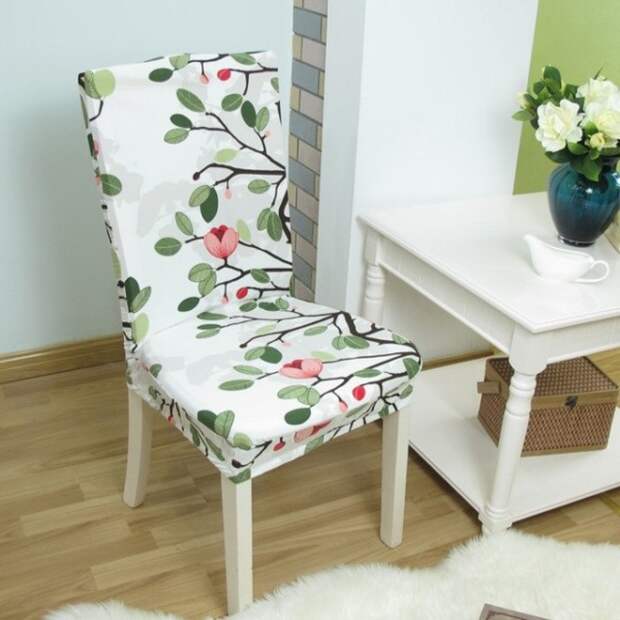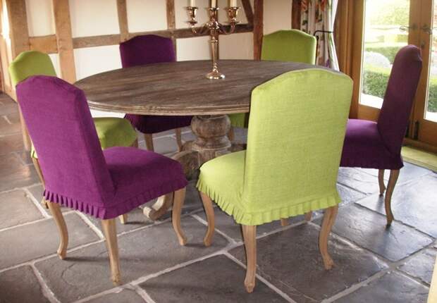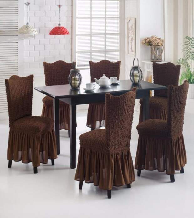 Оригинальный способ преобразить интерьер – надеть чехлы на стулья со спинкой. Но это не единственная функция накидки для мебели. Она защищает преображенные изделия и легко маскирует потертости и повреждения старых вещей.
