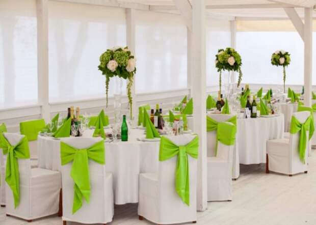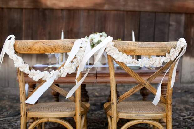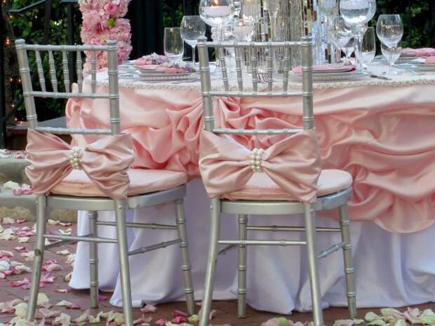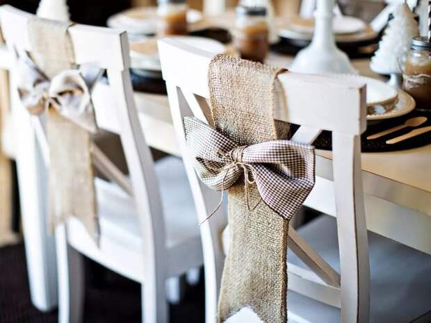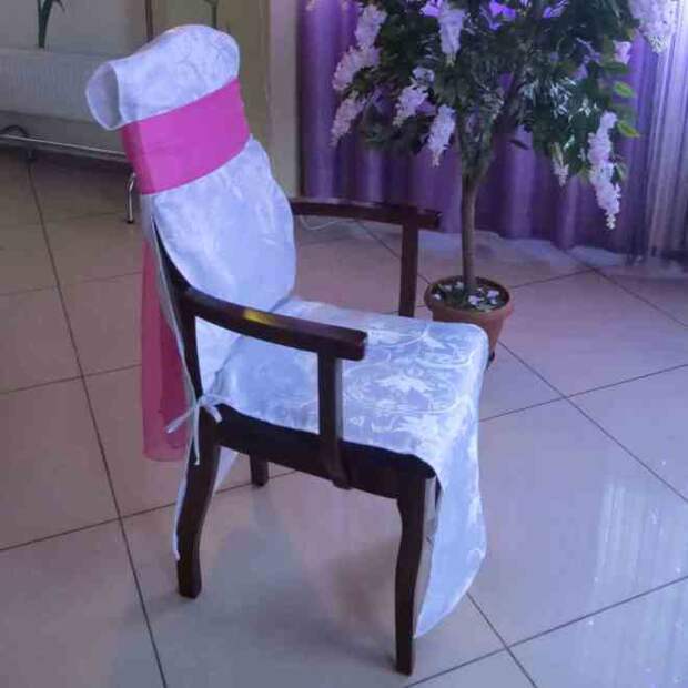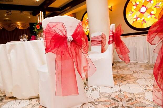 На свадьбах и иных торжественных мероприятиях ленты из шифона, органзы, тафты, шелка завязывают на спинке поверх чехла. Красивые ленточки могут быть контрастного цвета или одного тона с чехлом.