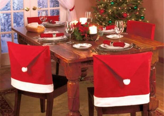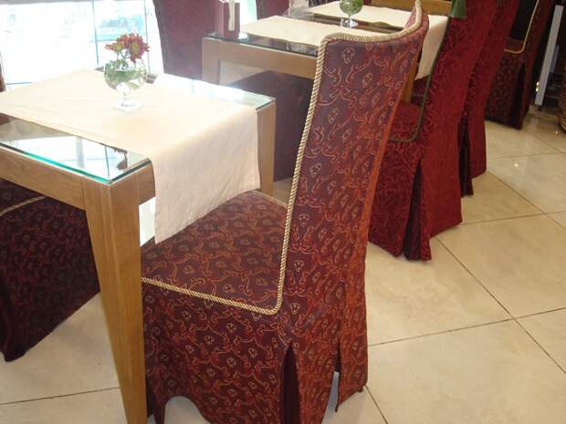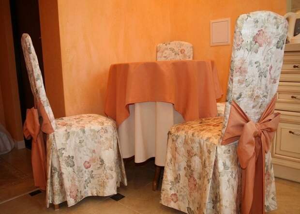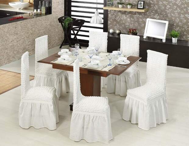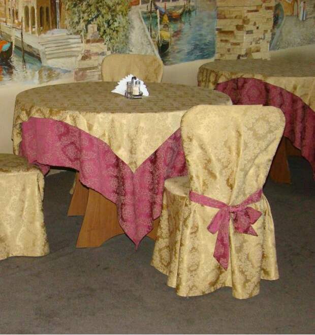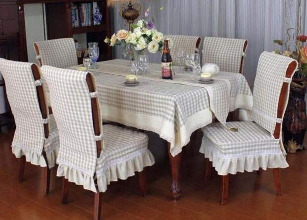 Ткань лучше всего подходит для оформления торжественной обстановки. Чехлы затейливого кроя способны украсить мебель в столовой зоне для праздничного обеда или ужина.
