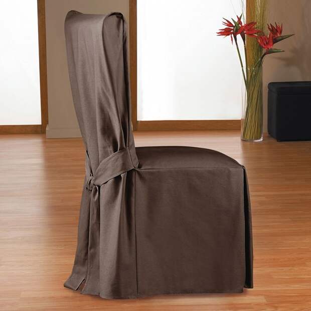 - Полноценный длинный чехол. Закрывает ножки мебели. Такая накидка имеет скорее декоративный эффект и может фиксироваться резинкой или лентой.