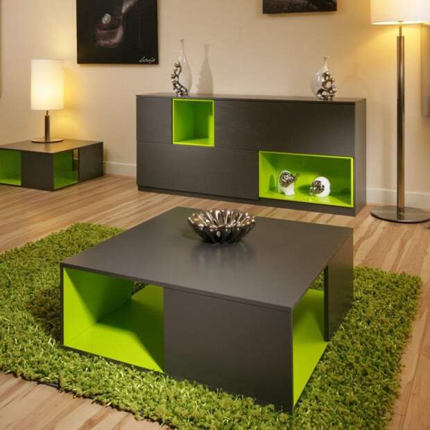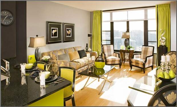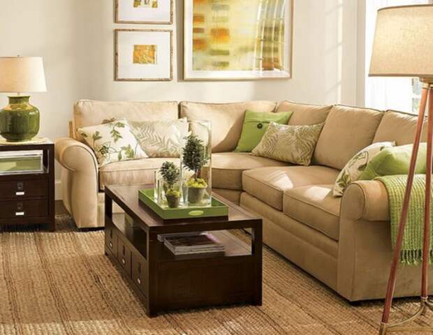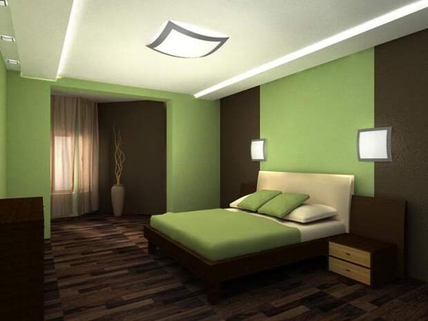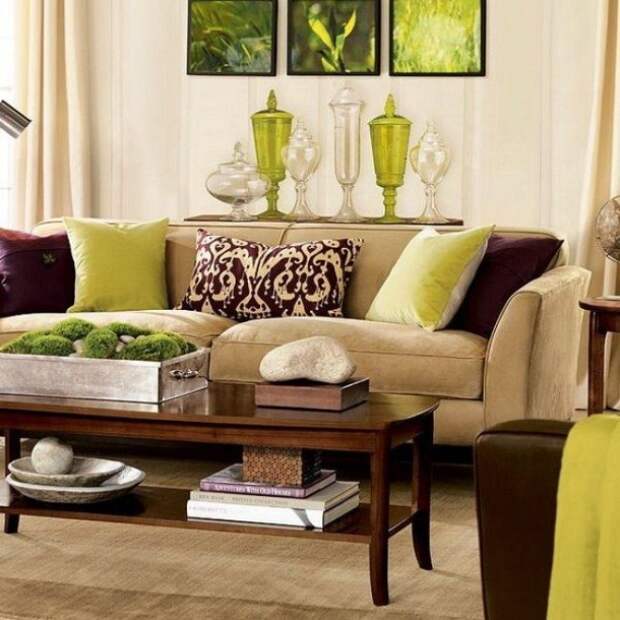 Салатовый, зеленый на фоне коричневой гаммы – это самое природное сочетание. Его выбирают для эко-стиля. Комнаты, декорированные живыми декоративными растениями, подходят для ценителей природы, правильного питания, людей с позитивным мышлением. Чаще именно травянистые тона лидируют в этой паре, наполняя помещение зеленой свежестью. Ансамбль цвета корицы и скошенной травы подходит для оформления открытого пространства студии, гостиной, столовой.