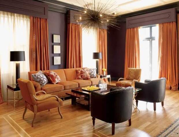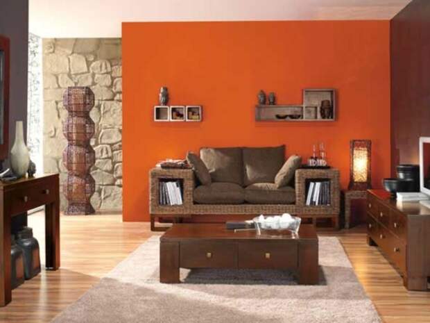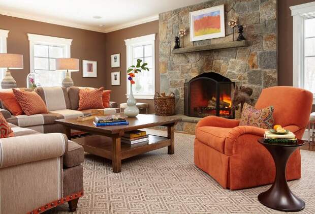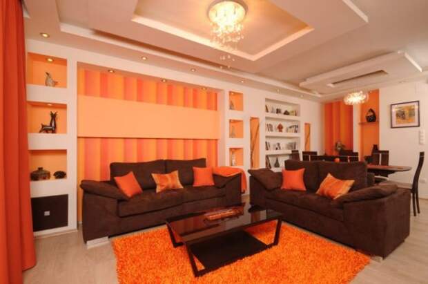 Как и в случаем с красным, оранжевый цвет заряжает атмосферу горячей аурой огня. Цвет имеет множество оттенков, более или менее насыщенных. Его можно выставить в качестве яркого акцента, если отдать предпочтение апельсиновому, или обыграть партнерство с кофейным оттенком, используя тон заходящего солнца. Выбирая сильный союз теплых цветов, нужно обязательно использовать несколько дополнительных нейтральных тонов. Хорошо в этом случае работают белый, бежевый, кремовый. Они создают необходимую гармонию, уравновешивая активные краски.