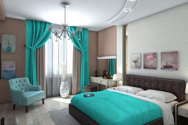 Бирюзу выбирают и для оформления детской. В этом случае обои подбирают нежного цвета морской волны в сочетании с белоснежным. А мебель покупают темно-коричневую. Интерьер детской в холодной гамме активно дополняют пестрые игрушки, предметы декора, живые растения.