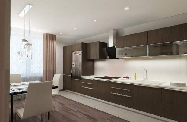 Выгодное решение для кухонного пространства – это партнерство темной мебели с бежевыми поверхностями помещения. Дополнить уютную атмосферу помогают красивые занавески на окнах и необычное сочетание пепельного пола. Такой вариант выглядит изыскано. Одновременно с тем, серый, коричневый, белый и бежевый создают ощущение праздничного уюта, настраивают на приятное общение.