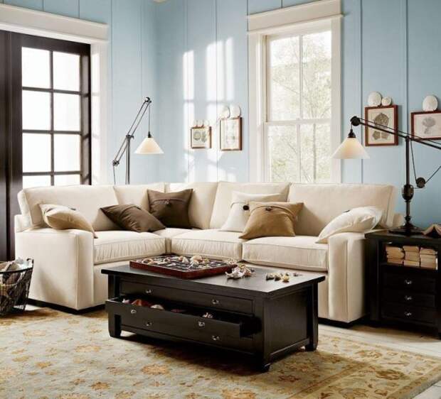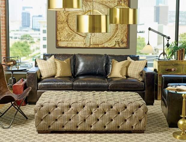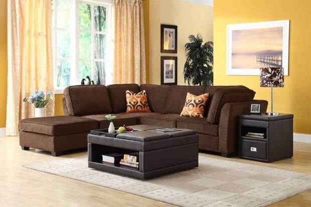Те помещения, где чаще всего принимают гостей, клиентов или партнеров, оборудуют предметами из натурального дерева, кожи и текстиля. Угловой коричневый диван – это классика, универсальный предмет мебели, который легко вписывается в любой стиль и интерьер. Обивка может быть из различного материала.