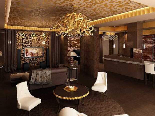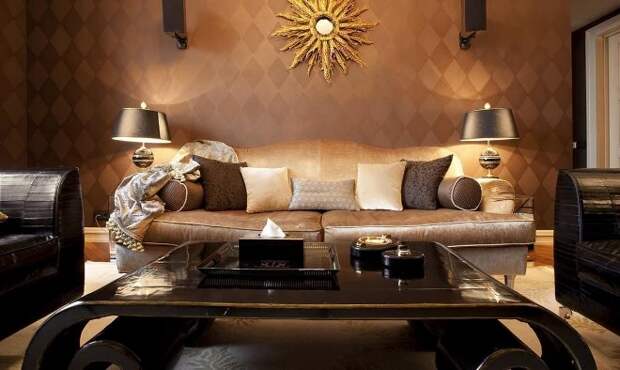 Роскошная пара – золото и шоколад – являются признаком дорогих, изысканных апартаментов. Приглушенная атмосфера дорого спокойствия, элитной неторопливости и разумной созерцательности привлекает в золотисто-коричневых студиях шиком, но в то же время умеренностью. Сочетание кожаных диванов с меховым покрывалом, мебели из ценных пород деревьев, сверкающих зеркал и шелковых штор не выглядит слишком пафосно, если не перегружать обстановку разноцветным декором. Единственный цвет, который можно пустить в золотую гостиную, – белый. Он является нейтральным, при этом часто выступает в роли ненавязчивого акцента на фоне темных поверхностей.