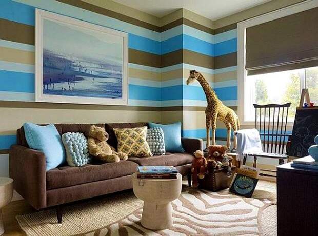 Детская комната юного капитана дальнего плавания – это идеальные условия для соединения голубых оттенков и коричневых. Палуба, штурвал, сундук для вещей – эти предметы делают из дерева одной породы, часто совмещая с потолочными массивными балками, поддерживающими корабельную тематику. Обязательным дополнением морской стилистики служат занавески в виде паруса и сети на стенах. Голубому достается практически второстепенная роль, несмотря на то, что цвет яркий и насыщенный.