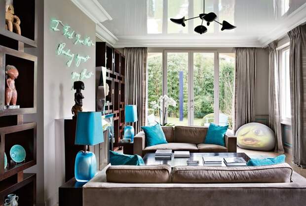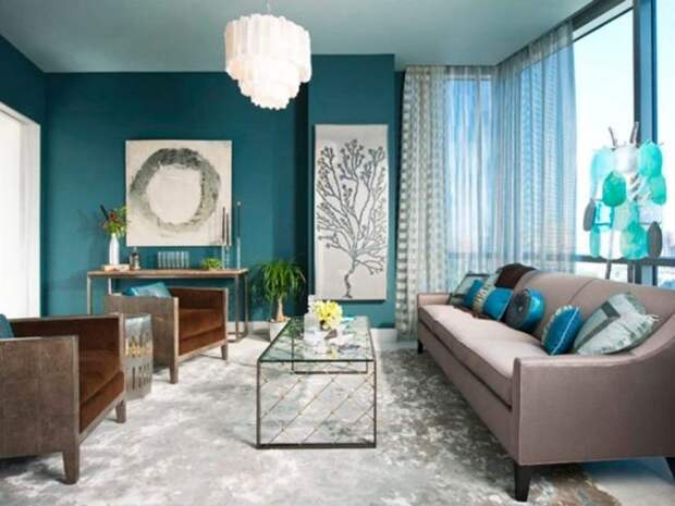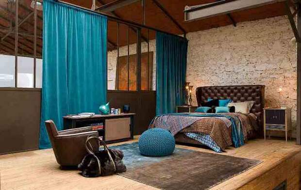 Контраст с холодной бирюзой – это шик дизайнерской мысли. Обстановка в этих тонах приобретает настолько свежий антураж, будто дыхание морского бриза разбивается о деревянную палубу старинного парусного корабля. Ассоциация с морскими волнами и просоленным деревом дает ощущение свободы духа и свободы выбора. Особенно интересный эффект контраст дает при оформлении дома в стиле лофт. Многослойные бирюзовые портьеры на фоне рыжины старых железных поверхностей, терракотовой кладки, пола из натурального дерева и открытых потолочных балок кровли создают потрясающий эффект.