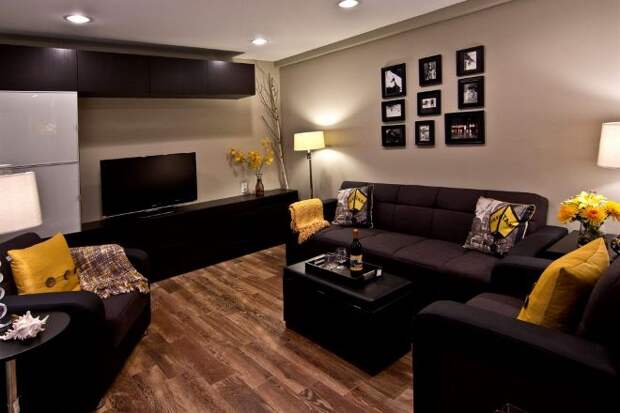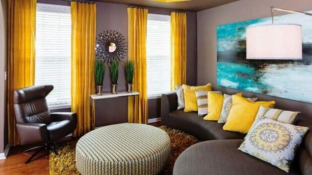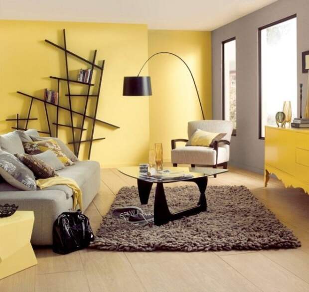 Насыщенный желтый цвет интересно смотрится в качестве броского элемента в просторных помещениях. Он наполняет их бодрой энергетикой, вносит нотку экзотичности в спокойствие древесной гаммы. Еще ярче этот цвет становится в сочетании с черными элементами.