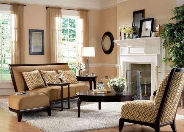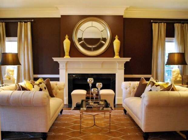 Коричневый цвет в интерьере гостиной сочетается со всем. В тон стенам подбирают мебель и напольное покрытие. Обрамление зеркал и картинных рам делают также в одном стиле. Задействуют светлую и темную палитру оттенков, оформляя стены и потолок. Центральный абажур подбирают из меди или дерева, как и все осветительные приборы в комнате. Важной деталью коричневого интерьера являются яркие элементы. Например, красные шторы или подушки.