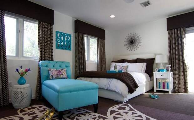 Универсальный коричневый цвет в интерьере создает атмосферу уюта и домашнего тепла. На его фоне ярко смотрятся акценты красного, золотого, белого, фиолетового цвета. Его дополняют близкие по палитре оттенки: бежевый, шоколадный, карамельный, шампань.