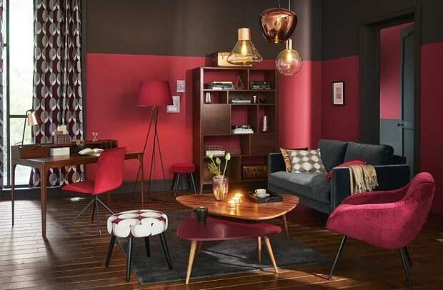 В союзе с горячим красным или насыщенным бордовым дерево приобретает теплую энергетику. В таких тонах принято оформлять домашний кабинет, мужскую комнату отдыха, гостиную в клубе по интересам. Сочетание с красным цветом имеет сильную энергетику: она не способствует умиротворению и спокойствию, но благоприятствует серьезным размышлениям.