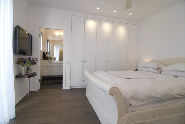 Отличный вариант организации систем хранения в комнате, где дверь находится не в центре. Специалисты советуют устанавливать глубокие шкафы, если это не создаст ощутимых неудобств. Мебель при этом одновременно сформирует мини-тамбур.