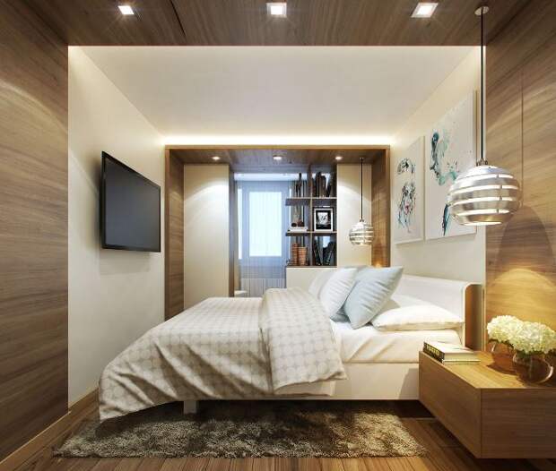 Чаще всего под спальню выделяют компактное помещение с одним окном. Так как двуспальная кровать занимает максимум площади, то необходимо сделать оптимально удобную планировку. Дизайнеры рекомендуют обратить внимание на несколько моментов: