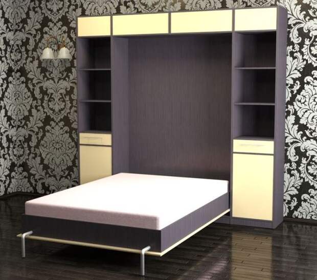 - шкаф-кровать в собранном виде используется как неглубокий шкаф, а в разобранном – образует полноценное спальное место. Компактная мебель бывает двух видов: горизонтальная и вертикальная. При выборе места установки надо учитывать площадь комнаты, габариты мебели (ширину и высоту). Одноместные модели можно располагать в углу комнаты, а двухместные – в центре помещения;