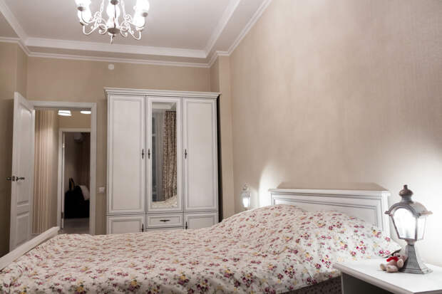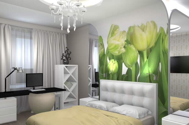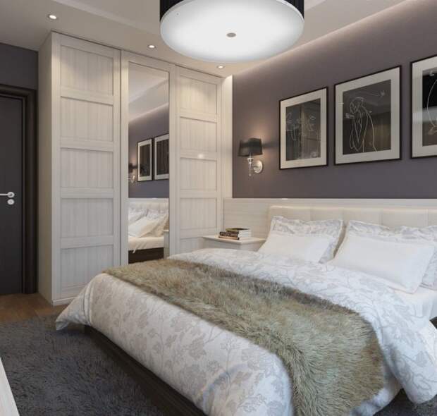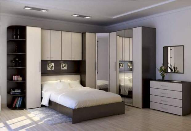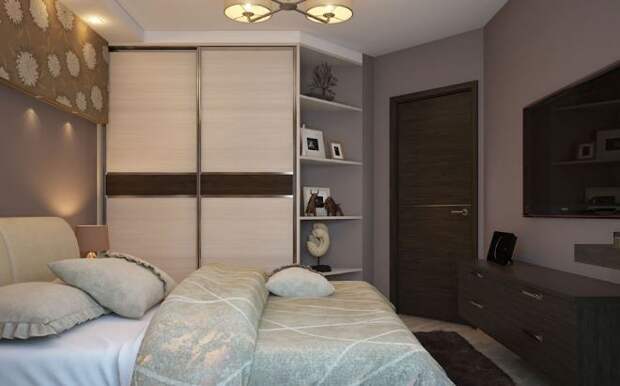 В маленьком пространстве, отведенном для спальни, размещают немного мебели – чаще всего это кровать, пара тумбочек или туалетный столик, небольшой шкаф или комод. Если в комнате два окна, то предмет для сна можно поставить между оконными проемами. В этом случае сбоку располагают прикроватные тумбочки. Вокруг окон можно соорудить шкафы. Интересная идея, если позволит площадь комнаты, – вместо перегородки установить один шкаф-купе, высотой до потолка с симметричными проходами по боковым сторонам.