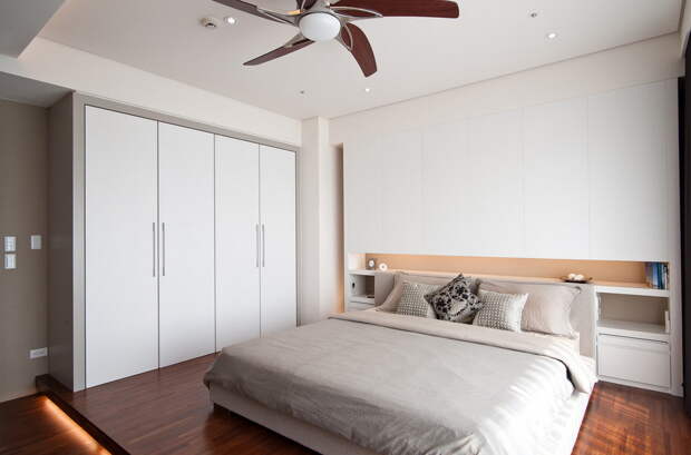 Оригинальный вариант – сооружение в квадратной комнате конструкции по типу алькова. Для этого два неглубоких широких шкафа располагают у стены, по краям кровати. Над ней фиксируют ящики с дверцами. Глянцевые светлые фасады в тон отделке стен придадут конструкции облегченный вид. Если мебель темная, то имеет смысл нишу за изголовьем сделать светлой. В маленьком помещении с невысокими потолками целесообразно симметрично установить только два узких невысоких шкафа. Благодаря этому мебель зрительно сделает комнату выше.