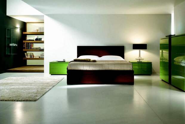 Спальня – приватная зона, куда нежелательно пускать посторонних. Естественно, что самую важную роль играет кровать. Рекомендуется выбирать мебель на ножках, чтобы под основанием и с двух сторон было свободное пространство. Основное правило – лежащий человек должен видеть входную дверь, но кровать при этом не должна находиться строго напротив дверного проема. При выборе места для ложа учитывается расположение частей света: