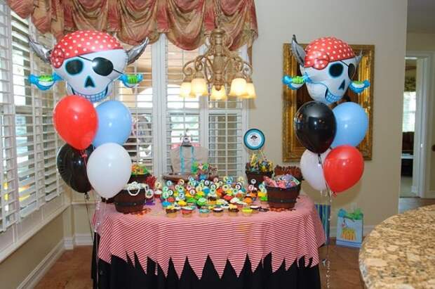 Максимально эффектно комната мальчика будет смотреться в этом стиле. Украсить детскую, а также зал, где будет проходить праздник, получится веревками, черепами с костями, сундуками. При оформлении пиратской вечеринки на столе и в комнате используются ткани черного, красного и белого цветов. Стены могут украшать игрушечные шпаги. Праздничный стол с необычным дизайном в виде корабля сбоку дополняется флагом экипажа.