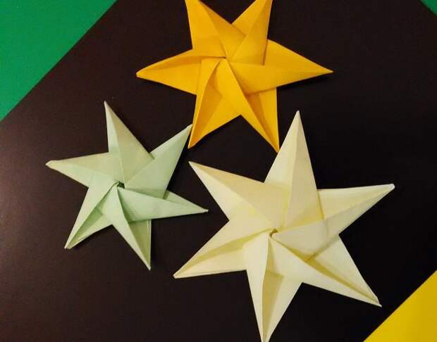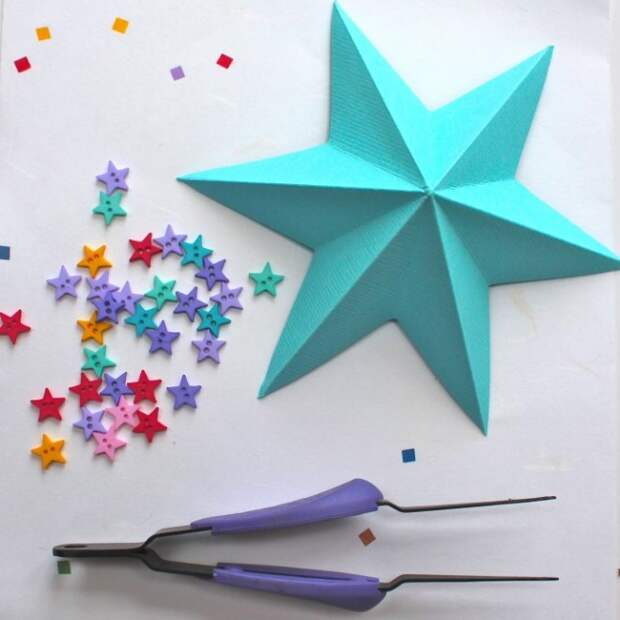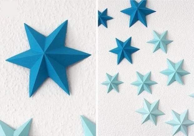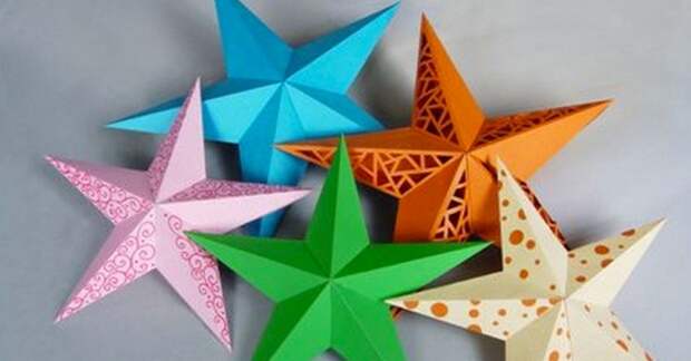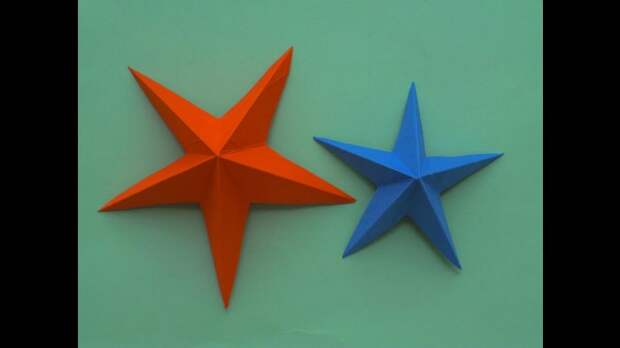 Для того чтобы создать объемную звезду, предварительно вырезают квадрат и складывают его, чтобы получилась одна половинка фигуры. По такой же схеме мастерят вторую часть, затем склеивают их между собой.