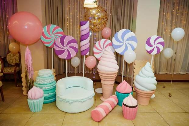 На каждой детской вечеринке должен быть небольшой столик, оформленный в виде кэнди-бара. Здесь стоят кексы, конфеты на стойках, панкейки, молочные коктейли, попкорн и торт. Дополнительно бар украшается в стиле праздника. Органично на столике будут смотреться праздничные зонтики в детских коктейлях, шпажки и фигурки с любимыми героями.