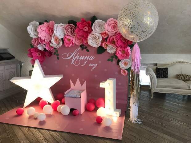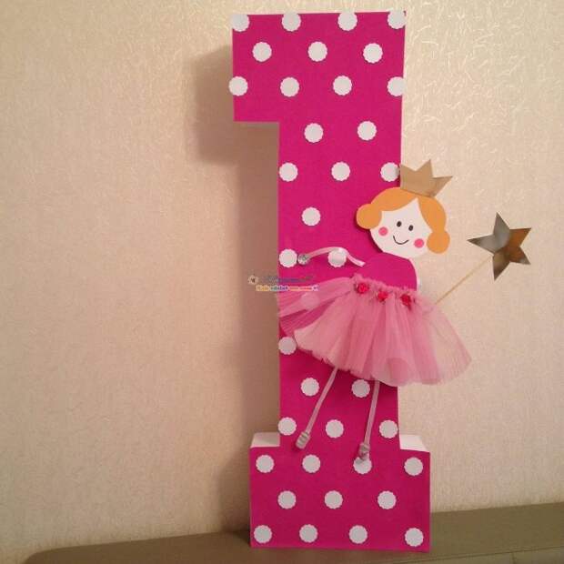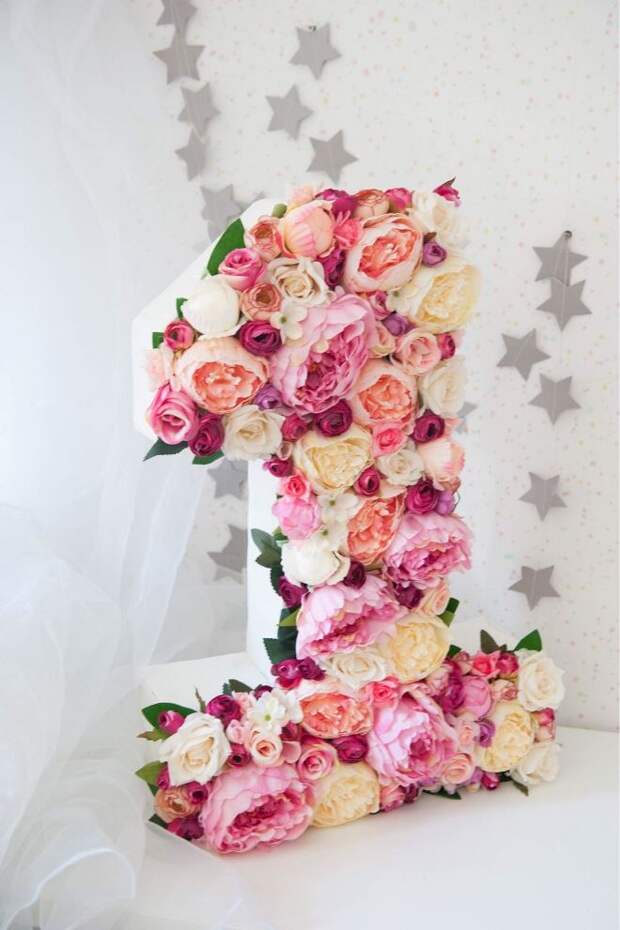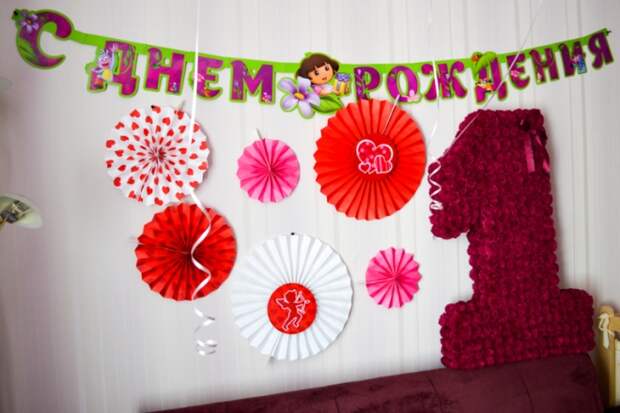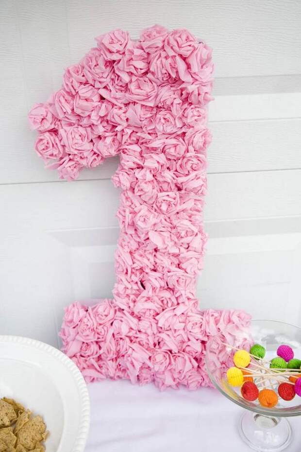 Домашний праздник не обойдется без главного атрибута первого дня рождения – цифры 1. Сделать украшение получится самостоятельно или же купить его в магазине с праздничным декором. Именно однерка будет стоять во главе всей экспозиции и станет прекрасным фоном для фотосессий. Изготовить декор получится, используя картон, ленты, бумажные цветы или гофрированную бумагу.