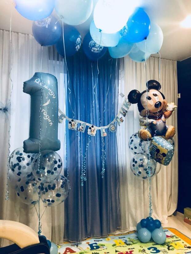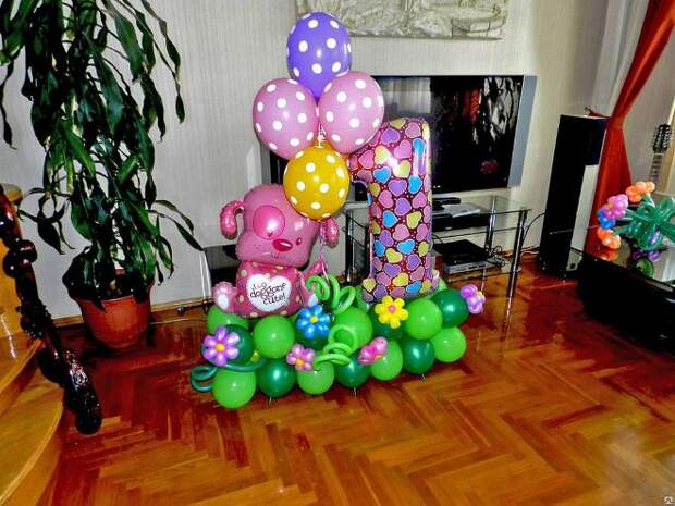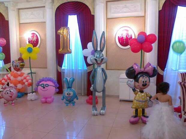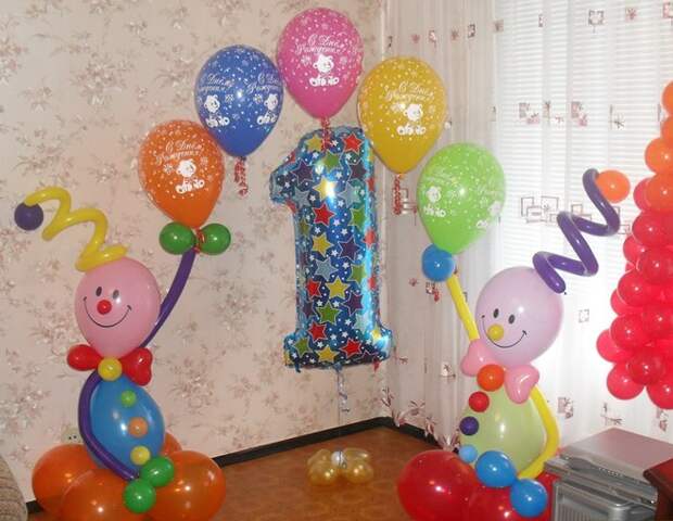 Маленький ребенок придет в восторг, когда увидит на своем празднике большое количество воздушных шаров. Малышам очень нравится играть с надувными украшениями. В этом случае выполнить декор комнаты на день рождения ребенка на 1 год своими руками не удастся. Лучше всего заказать в магазине готовые арки из воздушных шаров или же гелиевыми изделиями украсить потолок. Оригинально будет смотреться надувная цифра 1.