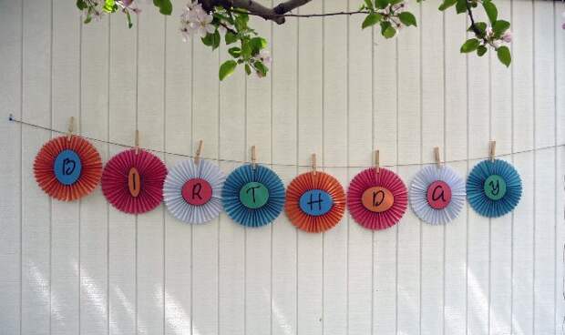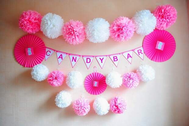 Очень просто самостоятельно оформить комнату в виде гирлянд из кисточек. Из гофрированной бумаги вырезается неширокая полоска, которая должна быть вдвое больше кисточки. Ее достаточно сложить пополам и разрезать, чтобы получилась бахрома. Закрепляется каждая кисточка на общей нити.