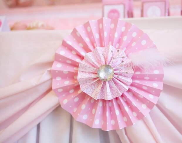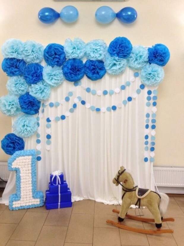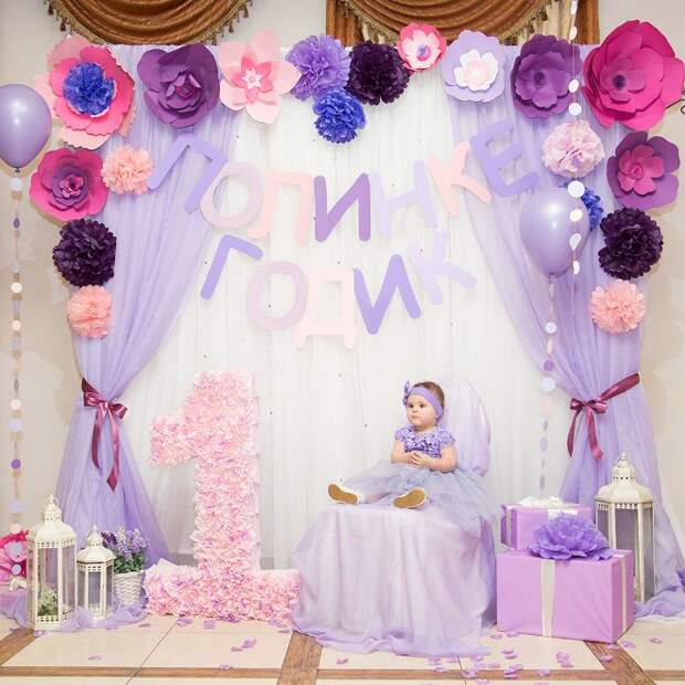 На первый юбилей крохи можно приобрести бумажные розочки. Цветки из бумаги – это красивый и безопасный для маленьких деток вариант декора. Самостоятельно сделать розочки не составит труда, если запастись гофрированной бумагой и проволокой. Украшение может красиво свисать с потолка или же стать органичным дополнением праздничного стола. При помощи крупных роз получится украсить трон малыша, на котором тот будет сидеть вместе с родителями.