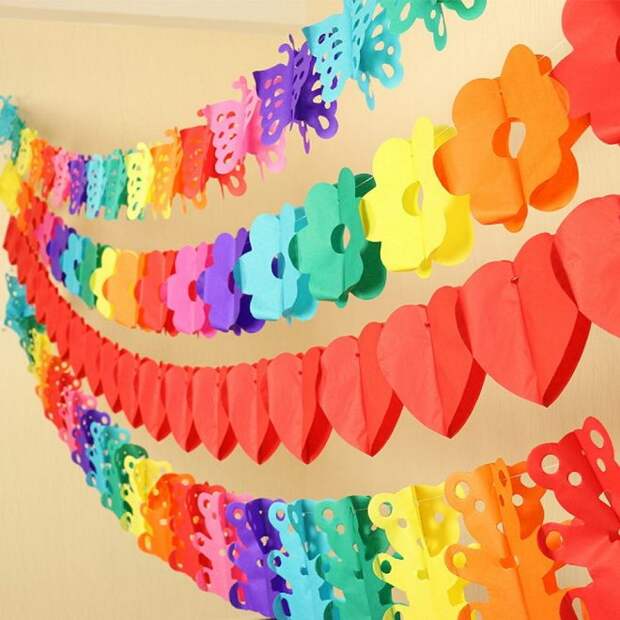 Создать торжественный антураж для праздника будет несложно, используя декор в виде гирлянд. С их помощью получится украсить потолок, стены, шторы и арки. Изделия необходимо подобрать в одном цвете или выбрать разноцветные варианты, где каждая деталь будет выполнена в разном оттенке.