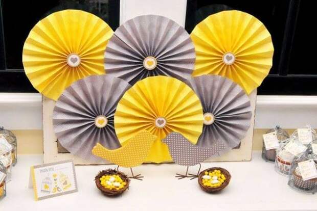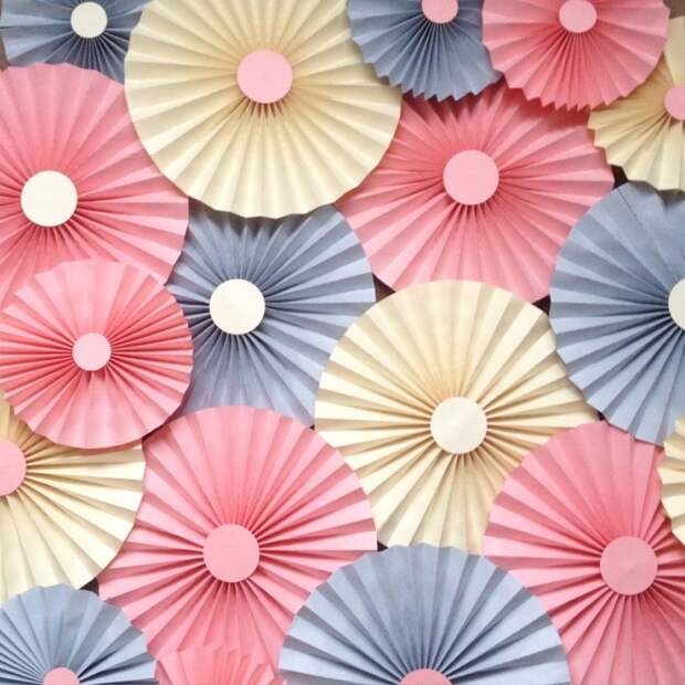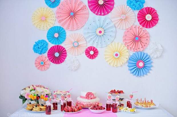Детский праздник не обойдется без этого простого на первый взгляд, но очень необычного украшения. Зонтики можно подвесить на стену, создав необычную композицию для фотосессий. Сделать это оригинальное украшение самостоятельно несложно, каждый зонтик чаще всего выполняется в разном цвете. Перед изготовлением стоит приготовить бумагу для скрапбукинга, клеевой пистолет, степлер и салфетки.