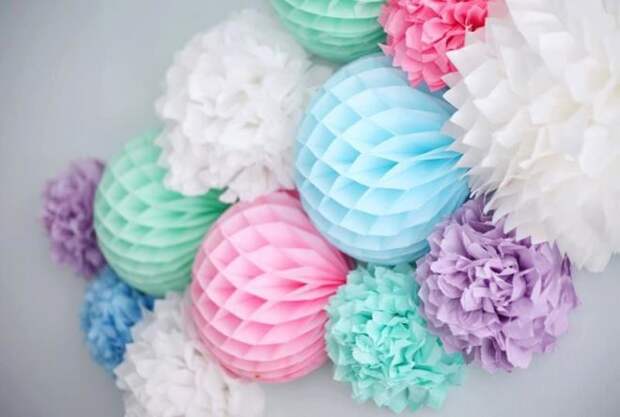 Главный плюс бумажных украшений состоит в том, что они выглядят максимально красиво и воздушно. Гостям и маленьким деткам будет казаться, будто шарики парят над комнатой.