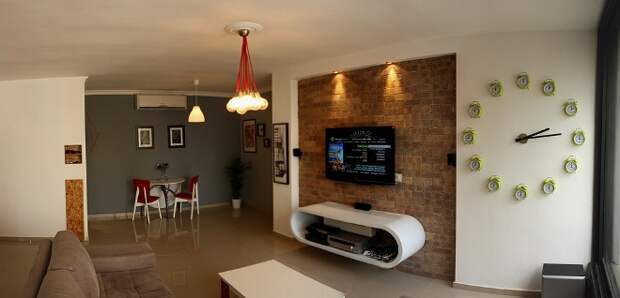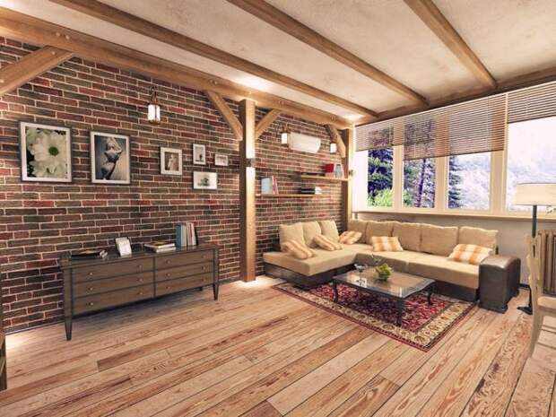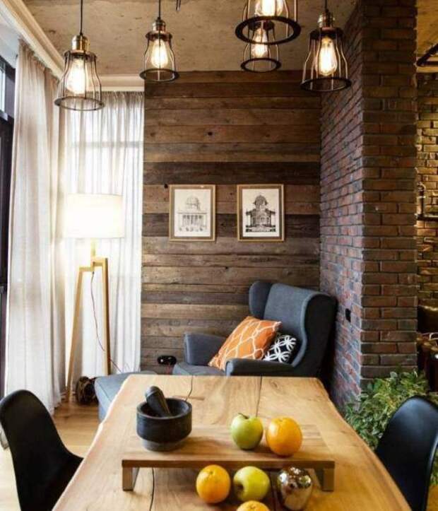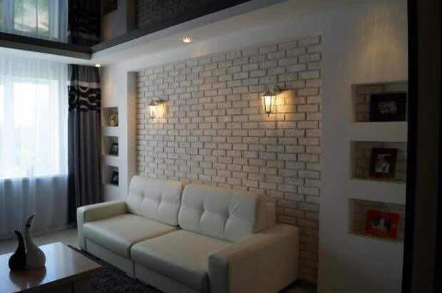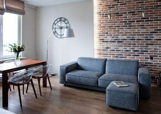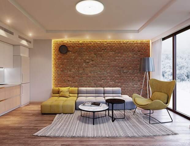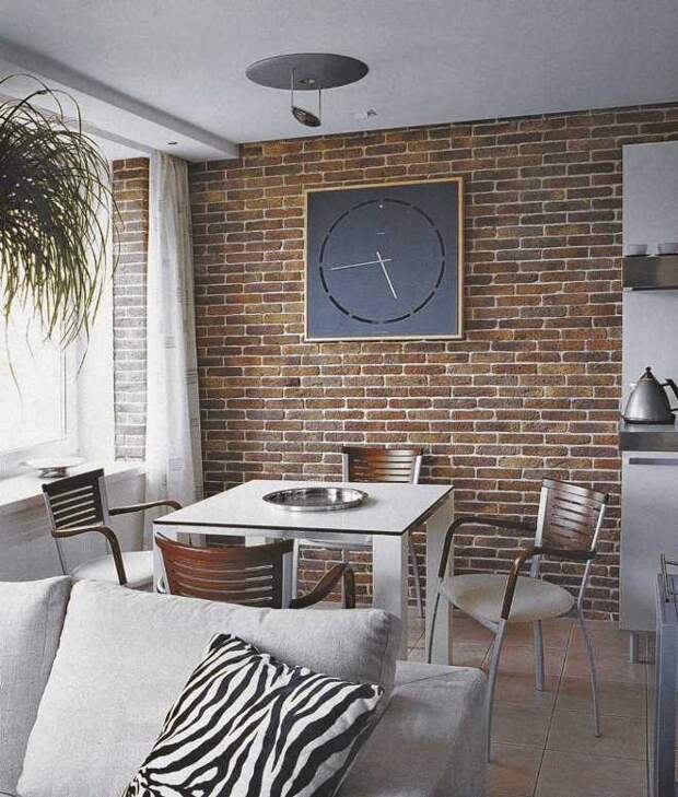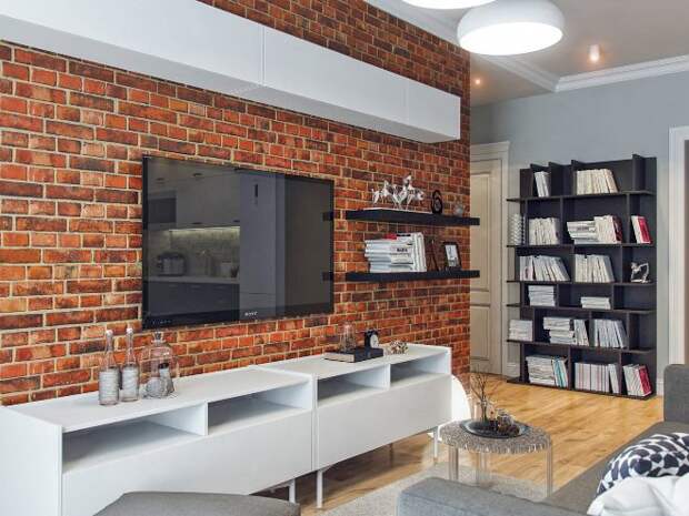 Главное — выбрать стиль и прикинуть, какую именно стену лучше отделать. Или, может быть, не стену? Может быть, гвоздем программы будет камин, который для этого стоит обрамить кирпичом? Или выход на лоджию, который тоже может комбинироваться с кирпичной кладкой? Или вовсе сделать маленький кирпичный участок в середине самой длинной стены и повесить туда телевизор?