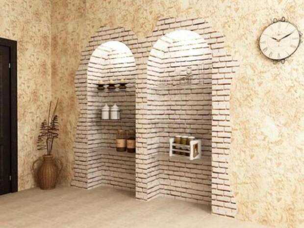 Кирпичом можно декорировать не только эркер, но и нишу в стене. А потом поставить в нее телевизор, угловой шкаф, печку или кровать — все, что позволяет ее размер.
