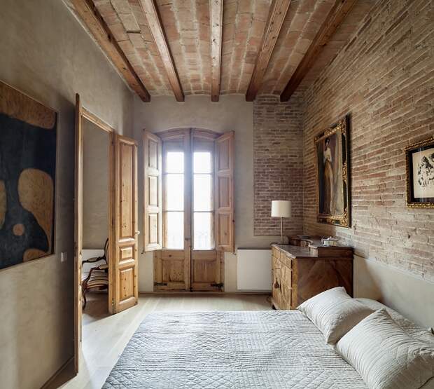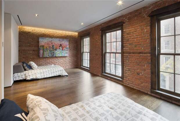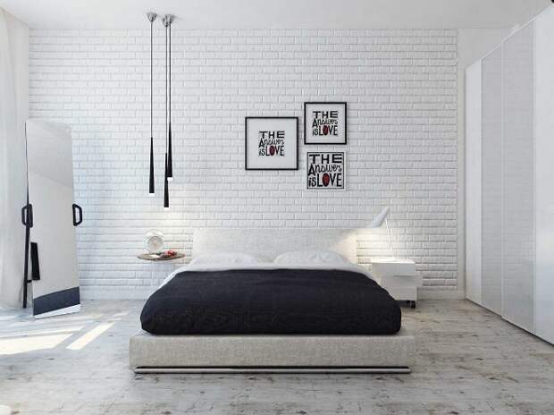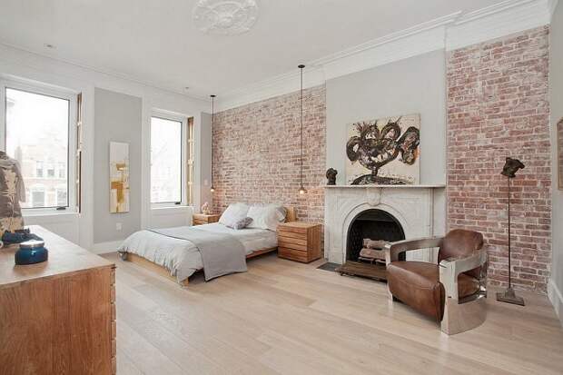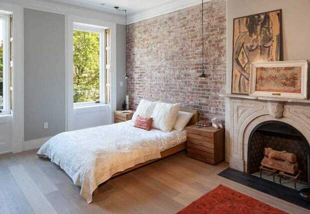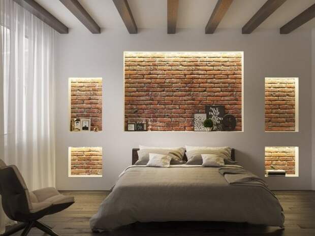 Стена из кирпича в спальне