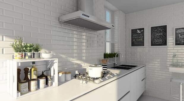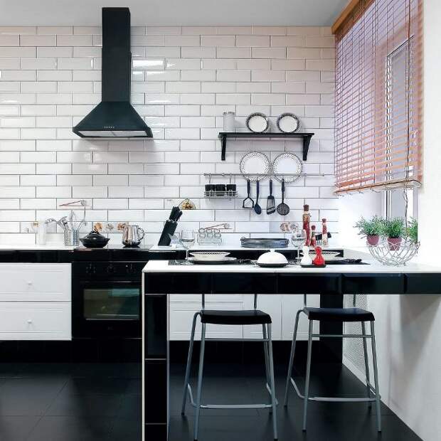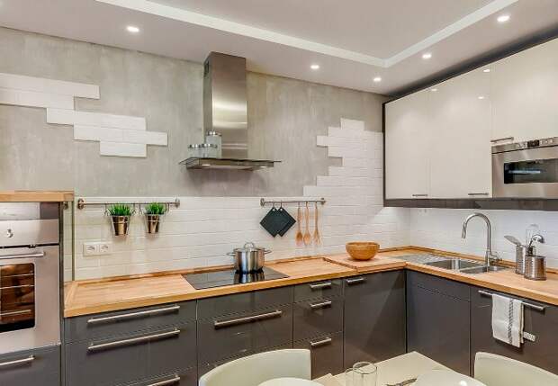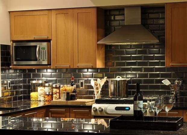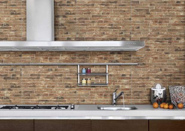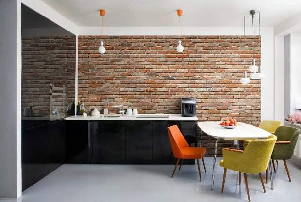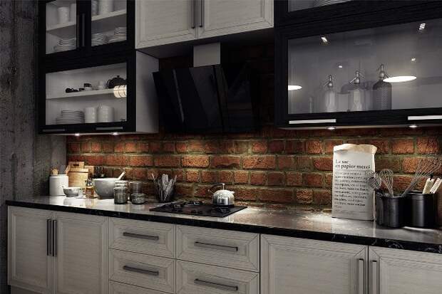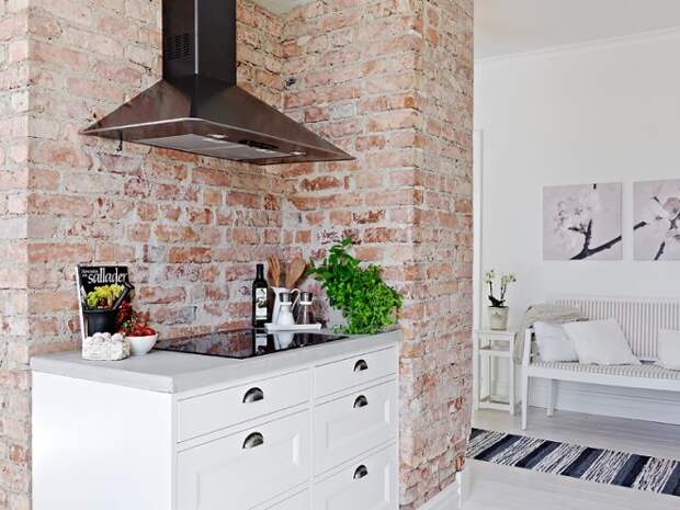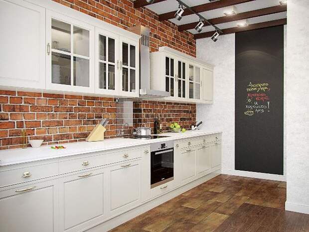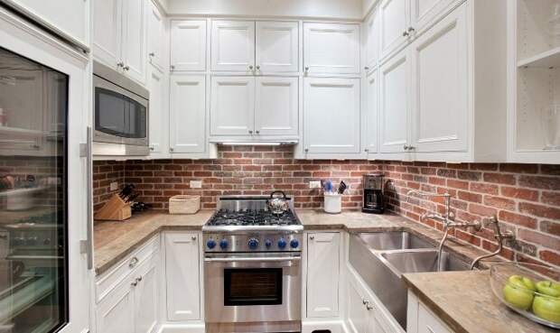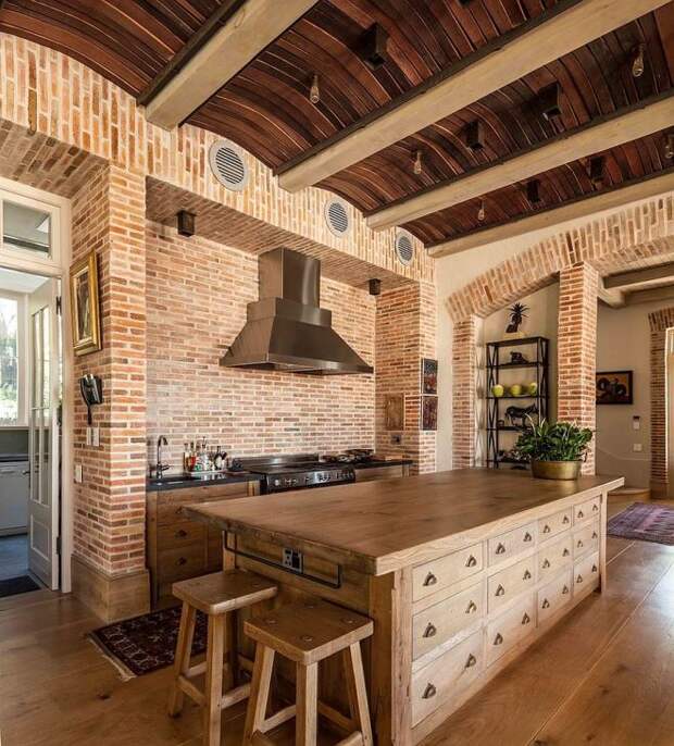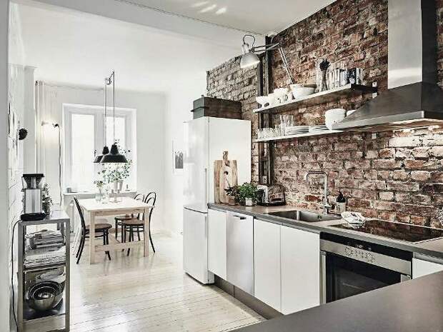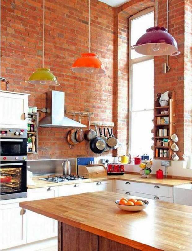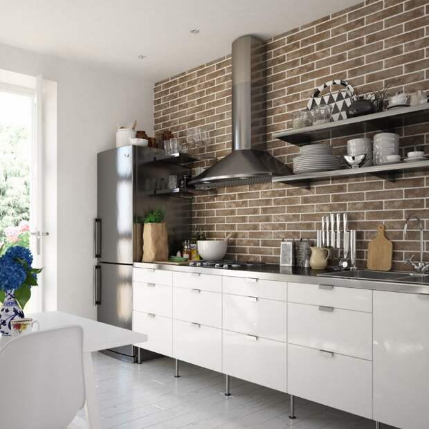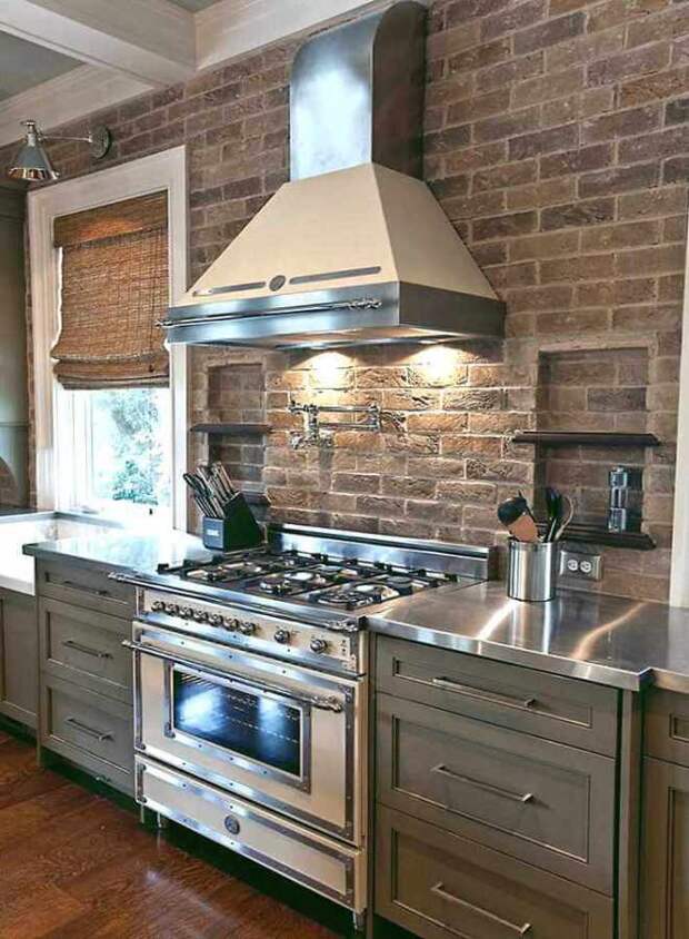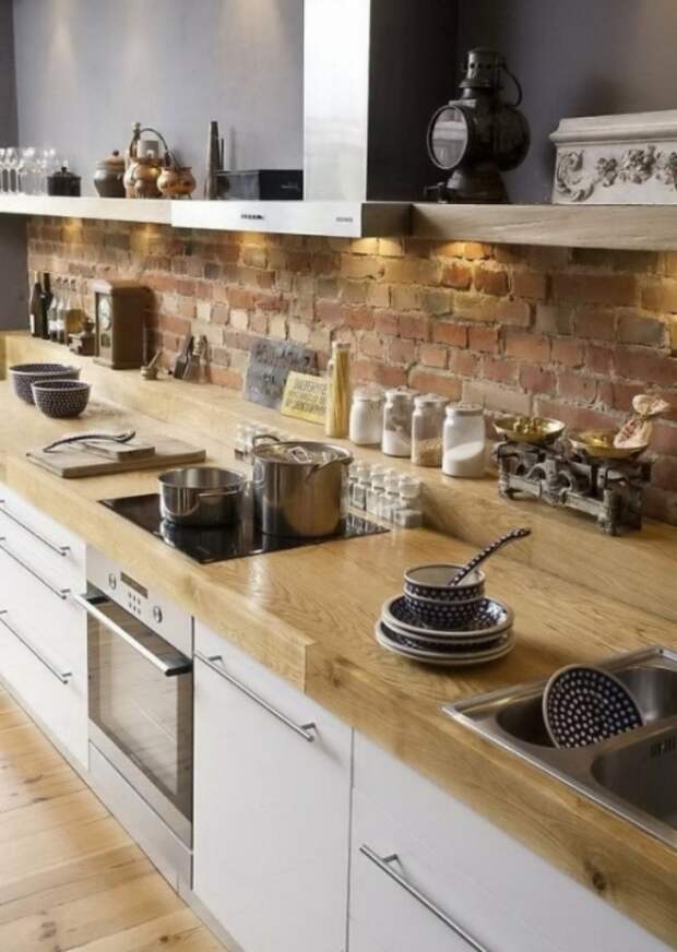 На кухне стена из кирпича наиболее уместна в зоне кухонного фартука. Там постоянно что-то режут, варят, там брызжет жир, соки и другие жидкости, которые могут оставить пятна. Кирпичу это все не страшно: его легко вымыть, если возникнет такая необходимость.