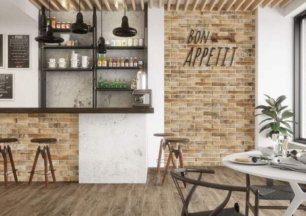 Его укладывают на клей, как плитку, и по свойствам он очень похож на нее, но выглядит почти как натуральный материал. Именно такой искусственный кирпич в интерьере смотрится лучше всего.