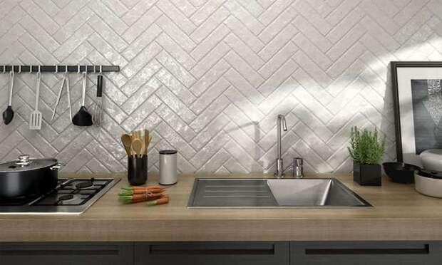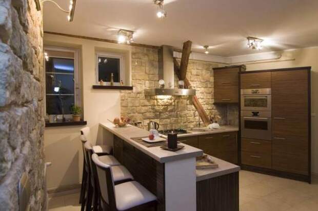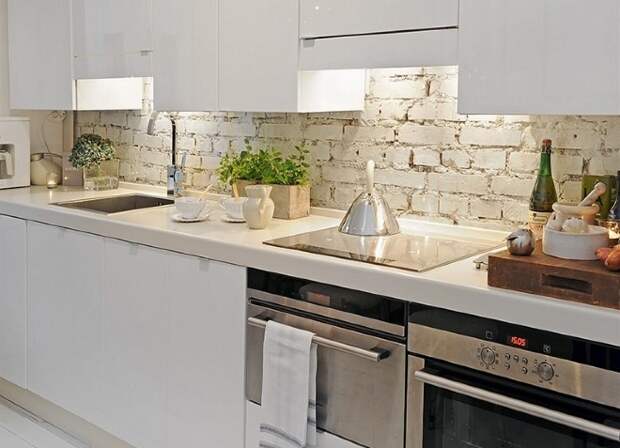 Также стена просто выглядит красиво. На ней можно нарисовать натюрморт или оставить, как есть. И, конечно, нужно обеспечить освещение, которое сделает акцент ярче, а работу на кухне – проще.