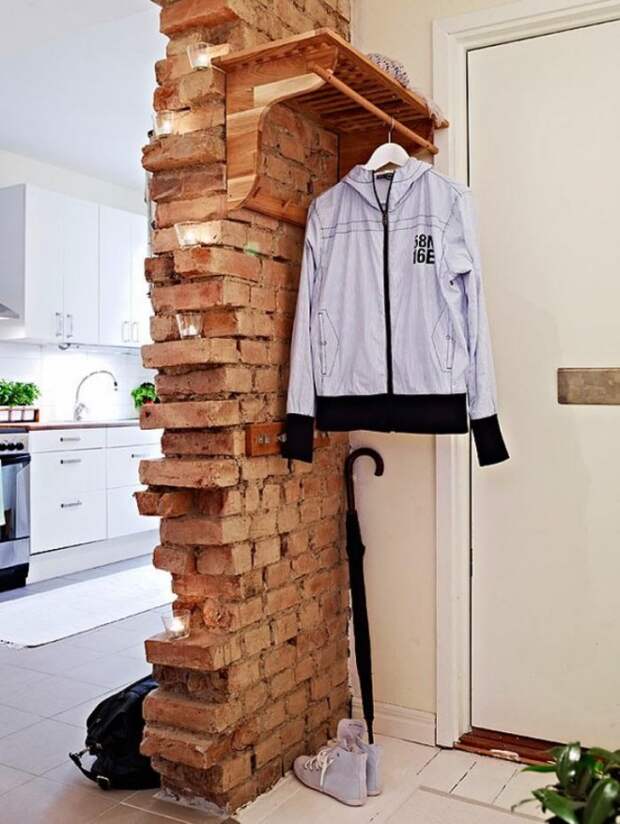 В прихожей стена из кирпича может быть как цельной, так выступать в качестве обрамления для зеркала, идти вдоль коридора или подчеркивать вешалку для гостевой одежды. Основной ее плюс в том, что даже в условиях постоянно приносимой снаружи грязи и перепадов температуры от входной двери, кирпич служит долгие годы и отлично выглядит.