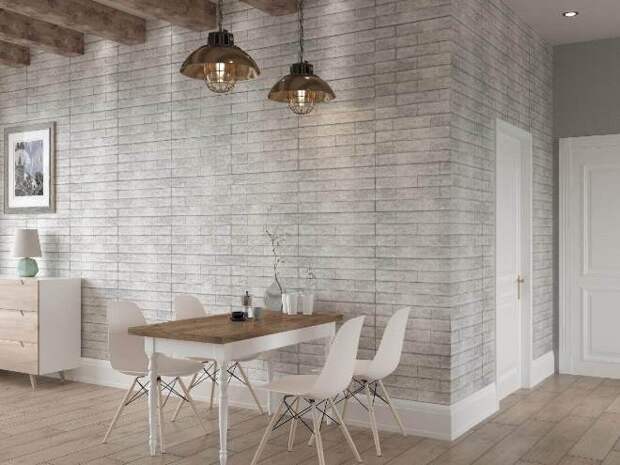 Дешевый и простой вариант, который не передает всей прелести настоящего кирпича и не обладает его свойствами. Обои страдают от влаги и перепадов температуры, выцветают со временем и отслаиваются, плюс – за ними трудно ухаживать, поскольку агрессивная химия запрещена, да и просто протереть мокрой тряпкой нельзя. Обычно используют фотообои с рисунком стены либо клеят обои, которые пытаются передать текстуру с помощью наслоений бумаги. Выбирать обои стоит разве что в качестве временного варианта.