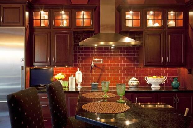 Для рабочей зоны на кухне кирпич – идеальный материал. Он не горит, не боится воды, не страдает от перепадов влажности, на нем не остается пятен, он не портится от механических воздействий. Более того, он становится важным элементом декора и гармонирует с любым оформлением, его можно совмещать даже со стеклом и металлом хай-тека, пусть это и не совсем классическое решение.