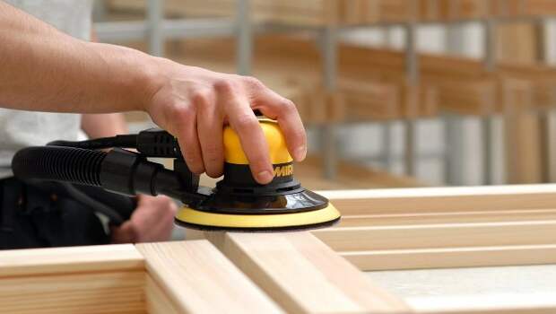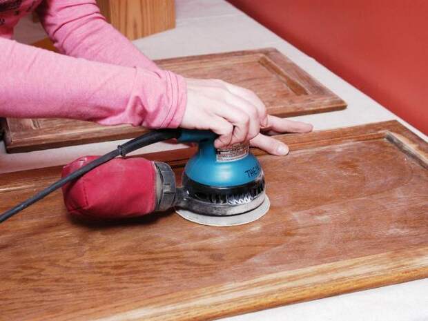 - С МДФ и массива счищаются старые покрытия (это лаки, эмали, краски). Применяют шлифовальные машинки, наждачную бумагу, шпатели.